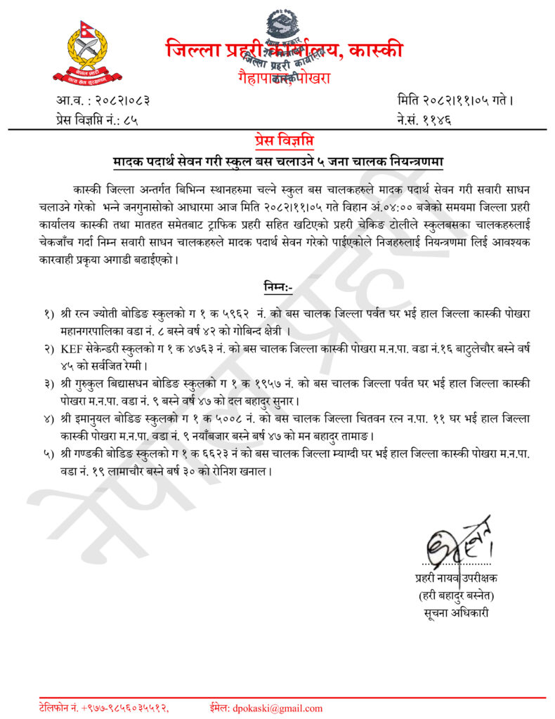 यसरी मादक पदार्थ सेवन गरि सवारी चलाउनेहरुमा श्री रत्न ज्योती बोडिङ स्कुलको ग १ क ५९६२ नं. को बस चालक पर्वत जिल्ला घर भई हाल पोखरा महानगरपालिका वडा नं. ८ बस्ने वर्ष ४२ का गोबिन्द क्षेत्री ,प्भ्ँ सेकेन्डरी स्कुलको ग १ क ४७६३ नं. को बस चालक पोखरा म.न.पा. वडा नं.१६ बाटुलेचौर बस्ने ४५ वर्षका सर्वजित रेग्मी ,श्री गुरुकुल बिद्यासधन बोडिङ स्कुलको ग १ क १९५७ नं. को बस चालक पर्वत जिल्ला घर भई हाल पोखरा म.न.पा. वडा नं. ९ बस्ने४७ वर्षका दल बहादुर सुनार ,श्री इमानुयल बोडिङ स्कुलको ग १ क ५००८ नं. को बस चालक चितवन जिल्ला रत्न न.पा.११ घर भई हाल जिल्ला पोखरा म.न.पा. वडा नं. ९ नयाँबजार बस्ने ४७ बर्ष का मन बहादुर तामाङ र श्री गण्डकी बोडिङ स्कुलकोग १ क ६६२३ नं को बस चालक म्याग्दी जिल्ला घर भई हाल पोखरा म.न.पा. वडा नं.१९ लामाचौर बस्ने ३० वर्षका रोनिश खनाल रहेको प्रहरीले जनाएको छ । उनिहरुलाई आवश्यक कारवाही प्रक्रिया अगाडि वढाईएको वस्नेतले वताए ।
