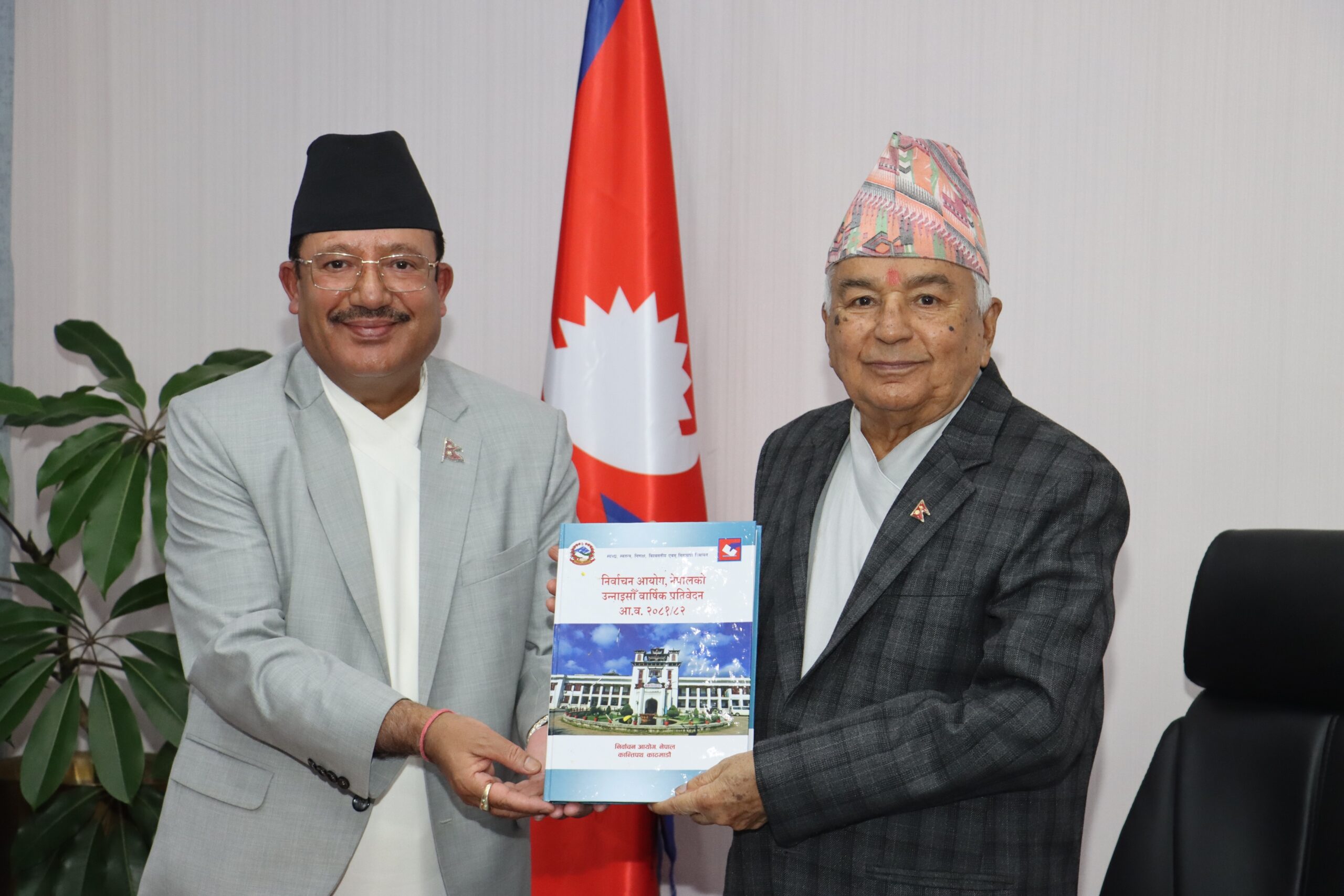 निर्वाचन आयोगले राष्ट्रपति रामचन्द्र पौडेललाई वार्षिक प्रतिवेदन वुझाएको छ । राष्ट्रपति भवन शीतलनिवासमा आज आयोजित कार्यक्रममा नेपालको संविधानको धारा २९४ बमोजिम २०८१ साल साउन १ गतेदेखि २०८२ साल असार मसान्तसम्म सम्पादन गरेका मुख्य काम कारबाही र उपलब्धि समावेश गरिएको उन्नाइसौँ वार्षिक प्रतिवेदन आगोगले राष्ट्रपति पौडेललाई वुझाएको निर्वाचन आयोगका प्रवक्ता नारायण प्रसाद भट्टराईद्धारा जारी प्रेस बिज्ञप्तीमा जनाईएको छ । आयोगका कार्यवाहक प्रमुख निर्वाचन आयुक्त रामप्रसाद भण्डारीले राष्ट्रपति पौडेललाई प्रतिवेदन वुझाएका थिए ।
